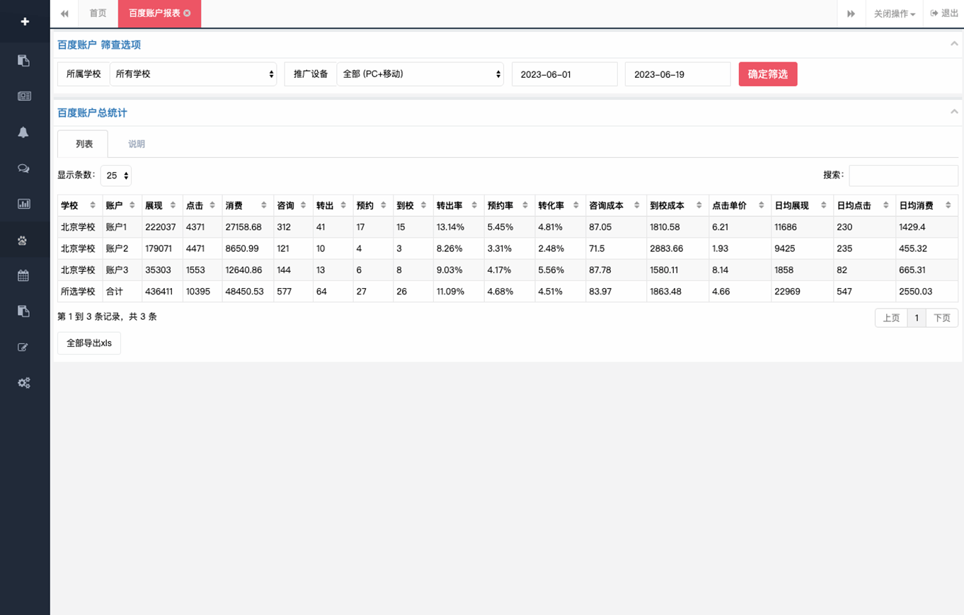 一鍵生成賬戶投放關鍵詞的咨詢、到校成本!