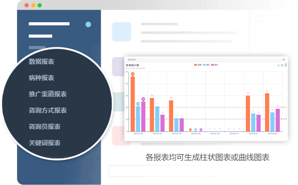 聚合百度、商務通數據,提供多種自定義生成數據報表、咨詢員報表、專業報表、推廣渠道報表、咨詢方式報表、關鍵詞報表;同時報表都可生成柱狀圖或折線圖,并且可以下載EXCLE表格。